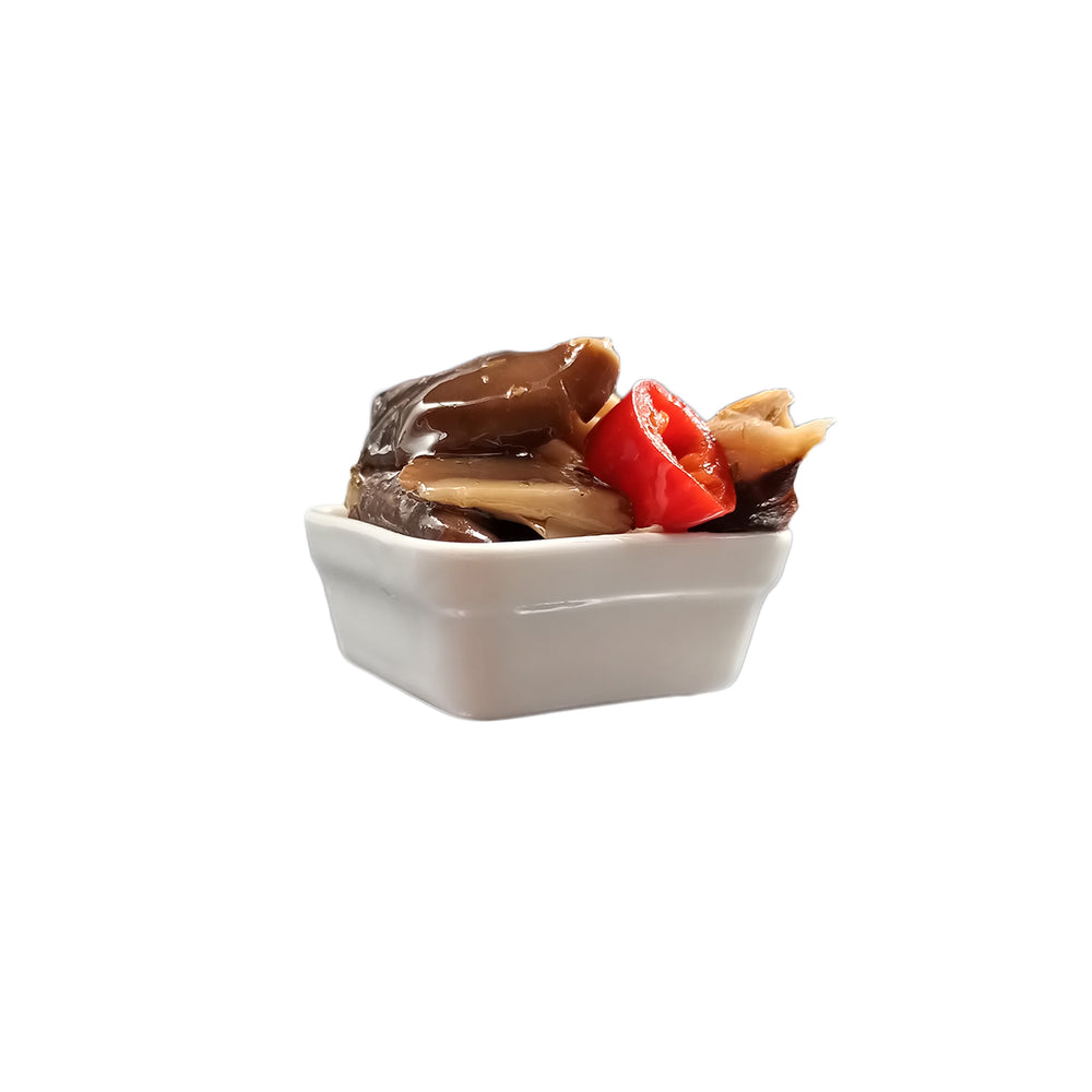 Ingredienti: Funghi cardoncelli (Pleurotus eryngii 65,9%), olio di oliva, peperoncino, aglio, origano, sale, aceto di vino.