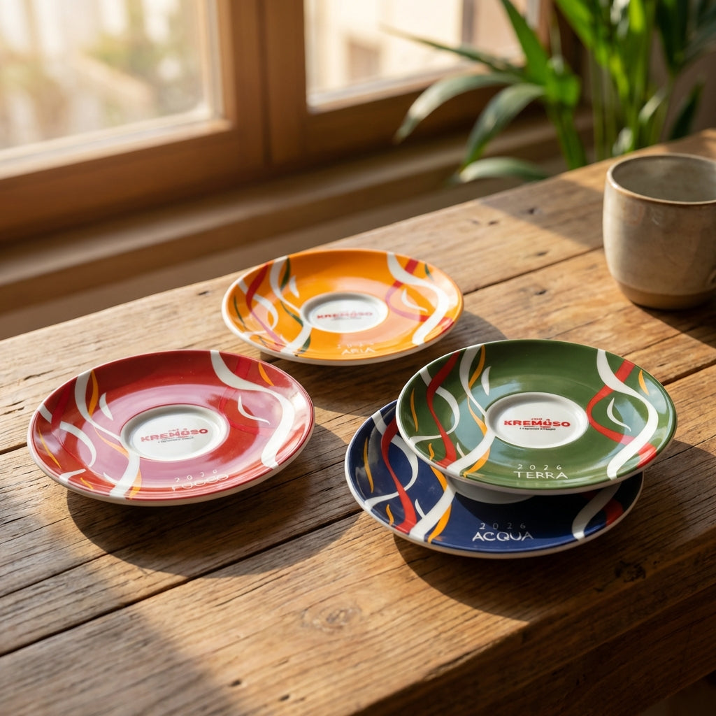 Set composto da 4 tazzine e piattini in ceramica della linea Kremoso, modello Collezione 2026 (aria, fuoco, acqua, terra). Perfetto come idea regalo.