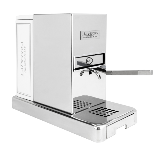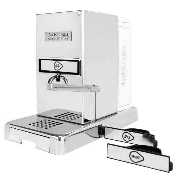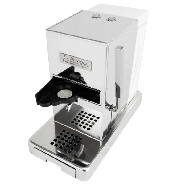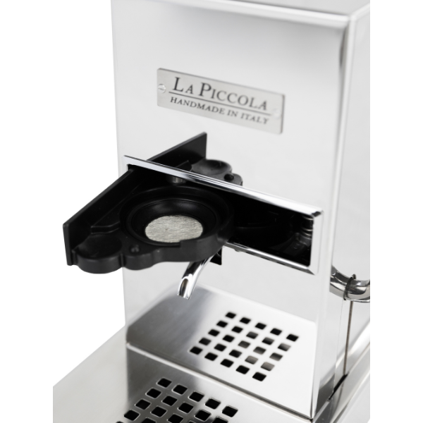 La Piccola con sportello mantiene tutti i pregi del modello Piccola Piccola: prepara un caffè espresso di qualità professionale e, grazie all’uso di cialde in carta e un bassissimo consumo energetico, rispetta l'ambiente ed ha un'elevata economia di esercizio.