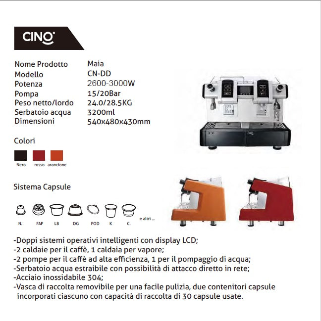 Die professionelle Kaffee- und Cappuccinomaschine Maia CN-DD Cino hat zwei Gruppen und arbeitet mit originalen oder kompatiblen Dolce Gusto-Kapseln; ideal für Kioske, Bars, kleine Restaurants, Ho.Re.Ca.