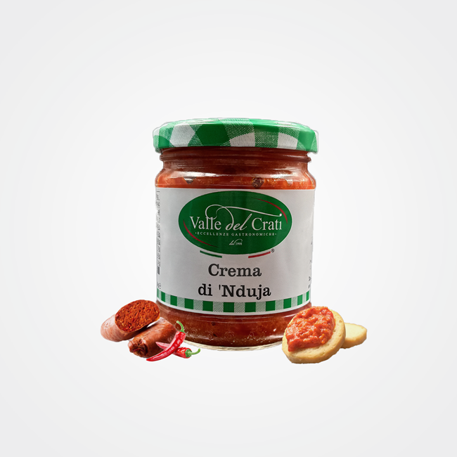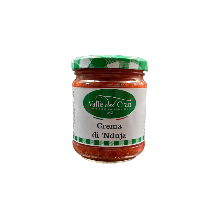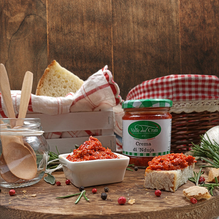 La crème de 'Nduja Valle del Crati est fabriquée à la main avec le salami calabrais le plus apprécié et l'ajout de piment fort, moulu dans de l'huile d'olive.